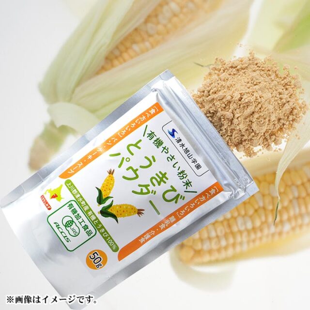北海道十勝清水町の圃場で農薬や化学肥料を使用せず、木炭とたい肥のみで栽培した有機栽培とうもろこしを100%使用し、パウダー状に加工しました。添加物・着色料は一切使用しておりません。