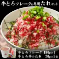 牛とろフレーク180g×1 牛とろ丼のたれ×1 セットです。 アツアツご飯に凍ったままふりかけて。 牛とろフレークは加工品(生ハム製法=非加熱食肉製品)です。 専用たれ付き。 贈り物やギフトなどにもおススメです。