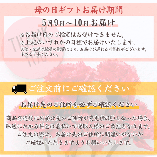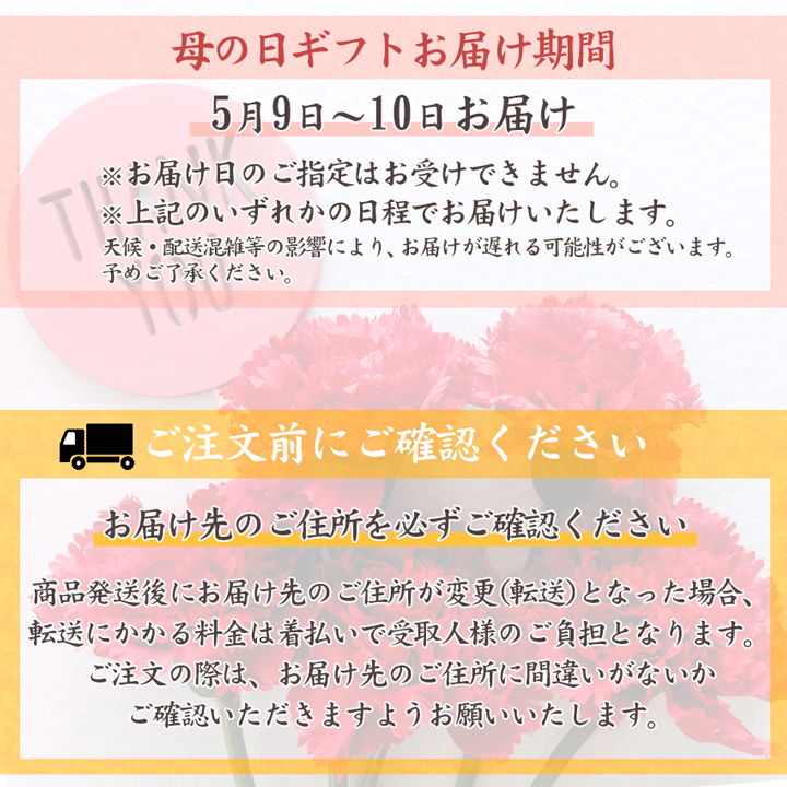 【注意事項】 ・天候・配送混雑等の影響により、母の日に間に合わない場合があります。 お届け日のご指定につきましては、お受けできません。 ご迷惑をおかけしますが、何卒ご理解賜りますようお願い申し上げます。 ※お届け時間帯指定について ご注文時にお届け時間帯指定をお受けしておりますが、こちらは配送業者様のサービスオプションです。 必ずしもお約束できるものではありませんので、ご理解のほどよろしくお願い申し上げます。 |